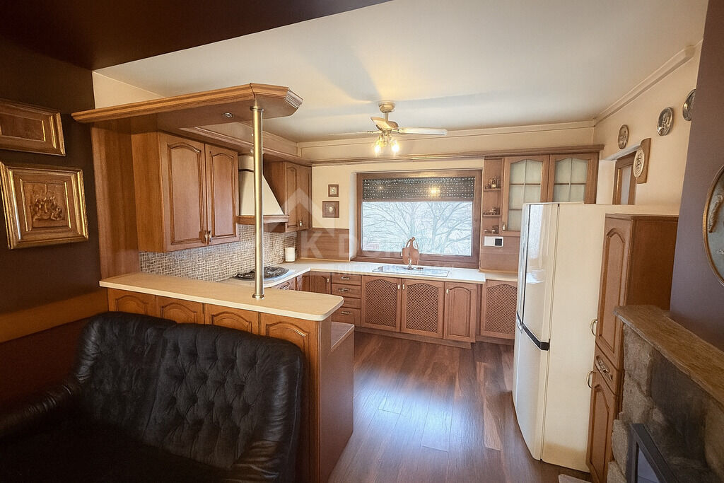 Living room with a fireplace with a water jacket Open-plan kitchen